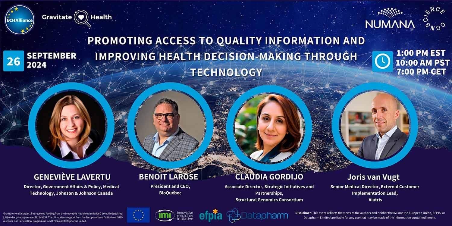 This panel session is a collaboration between Gravitate-Health, Numana, the ECHAlliance, and Conscience. It will discuss the role of technology in accessing information and making good decisions in a healthcare context. This event is a unique opportunity to bring people together across continents to explore key innovations with leading experts in the field. Here’s what you can expect: